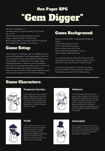 Gem Digger is a fast-paced Role-Playing Board Game for 2-4 players. Players take on the roles of specialized characters to earn points by excavating a grid of mystery cards.